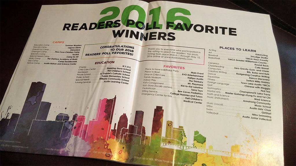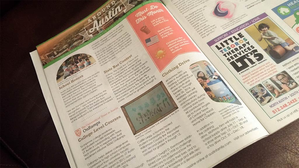 I recently served as Art Director of Layout Design for Austin Family magazine, an Austin area parenting magazine in its 24th year of publication as of 2016. During my stint there, I designed the full layout for the magazine on a monthly basis, while another designer on the team created and managed the ads. I focussed on creating lively, engaging layouts that would provide a rewarding reading experience for the whole family, and took special care to craft age-specific experiences in sections meant for children to read.